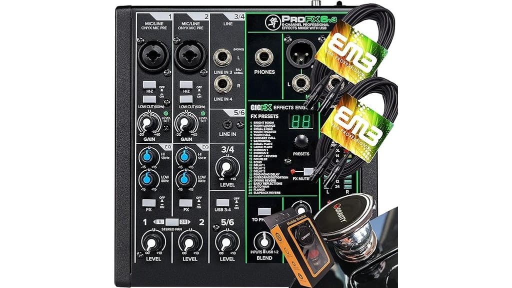 With the Mackie ProFX6v3, you harness exceptional audio quality to serve others effectively. Its two Onyx mic preamps provide pristine signals—akin to the clear voice of inspiration guiding your path. The 2-band EQ and low-cut filter refine your sound, a reminder that precision fosters connection.