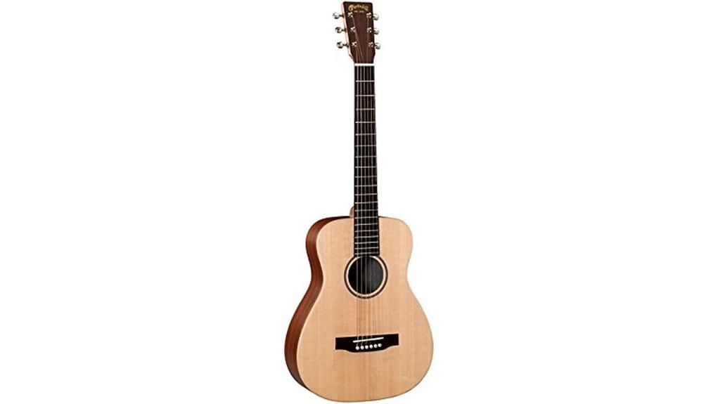 In contrast, the high-pressure laminate back and sides provide steadfast protection against life’s unpredictable journeys, ensuring the instrument remains a reliable companion for those serving others. This durable construction empowers caregivers to share music in varied environments without fear, effectively harmonizing aesthetic warmth with the practical, rugged strength needed for compassionate service. Because of this reputation for durability, the Little Martin is frequently recognized as one of the best acoustic guitars for travelers.