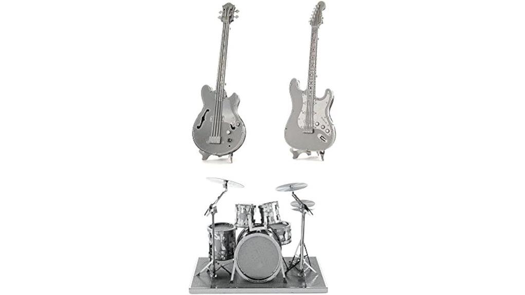 - This set includes three unassembled aesthetic models: a Lead Electric Guitar, a Bass Guitar, and a Drum Set.
