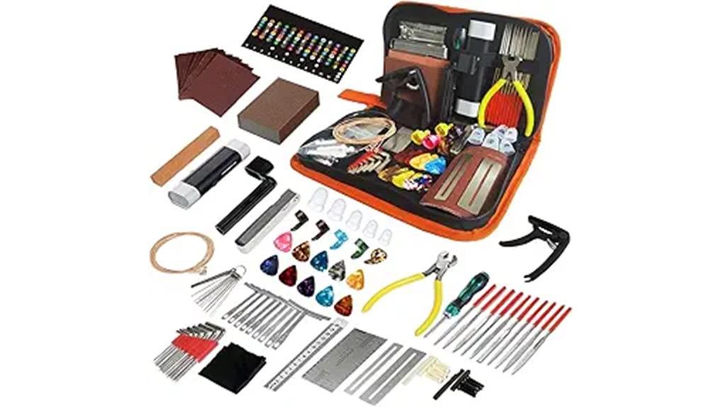 - This 99-piece collection includes essential tools like fret files, action rulers, and replacement hardware for comprehensive guitar maintenance.