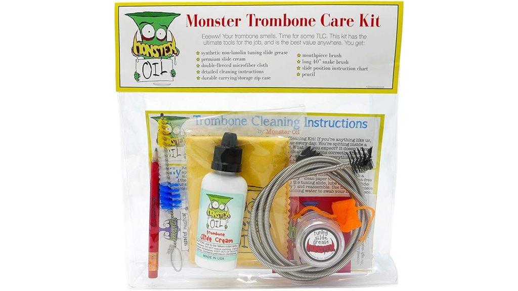 The Monster Trombone Care and Cleaning Kit stands as a demonstration to the harmony between instrument maintenance and personal discipline—its slide cream and specialized brushes serve not only to enhance sound quality but also to cultivate a sense of responsibility in players. Just as one nurtures their spirit through practice, so too does this kit promote the longevity of the trombone, echoing a profound truth: care leads to growth. What insights might this blend of artistry and upkeep reveal?