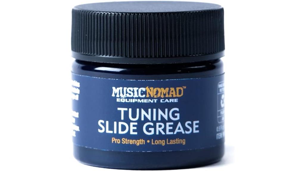 The MusicNomad Tuning Slide Grease Lube embodies a harmonious blend of advanced synthetic formulation and thoughtful design—much like the balance sought in life’s pursuits. Its ideal viscosity guarantees smooth operation of tuning slides, serving as a reminder that maintaining our instruments, akin to nurturing our souls, requires attention and care. This clear, odorless lube not only preserves the aesthetic beauty of brass instruments but also reflects a commitment to sustainability, inviting contemplation on our impact on the world. What insights might this product reveal about our own practices of stewardship?