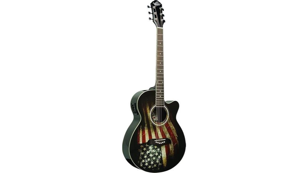 The Oscar Schmidt OG10CEFLAG-A stands as a tribute to patriotic expression, utilizing a standard 25.5-inch scale length to offer a familiar, ergonomic reach for the wandering minstrel. Crafted with select spruce atop a catalpa back, this concert body provides a resonant foundation, akin to a heart anchored in service.