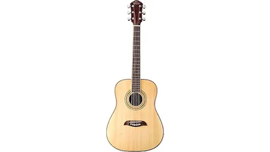 The Oscar Schmidt OG1PAK-A employs a 3/4 dreadnought design, utilizing a spruce top and catalpa back to offer midrange resonance, akin to the clarity found in simplicity.
