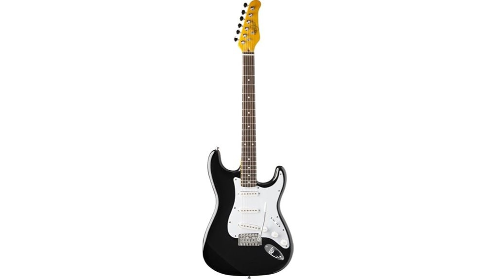 Though rooted in classic tradition, the Oscar Schmidt OS-300 BK emerges as a vessel of modern craftsmanship, its solid maple body shaped into a balanced double cutaway form that opens access to higher frets like pathways to elevated understanding. The maple neck, adorned with rosewood fretboard and dot inlays, guides the hand with quiet precision – akin to daily practice shaping character. Chrome diecast tuners guarantee steadfast tuning, a reminder that reliability fosters trust in service. Its gloss finish reflects light gently, much like humility polished through dedication. The standard tremolo bridge offers expressive nuance, teaching that controlled sway – within strength – deepens connection, both sonic and spiritual, for those who play not for fame, but for meaning. While not among the best electric guitars for professional stage use, it holds its own as a dependable instrument for learners and enthusiasts. A new sentence with best electric guitars for beginners and the rest of the sentence.