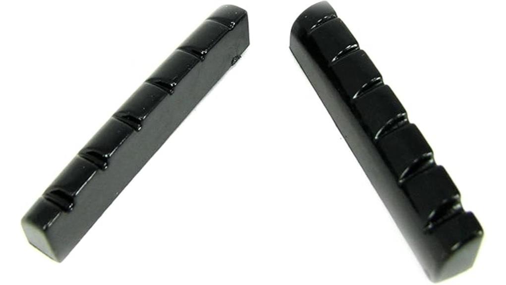 Black plastic is a material choice known for reduced warmth. For luthiers seeking to better serve a client’s preference: alternative options like bone are available to help guarantee the instrument’s best tone is achieved.