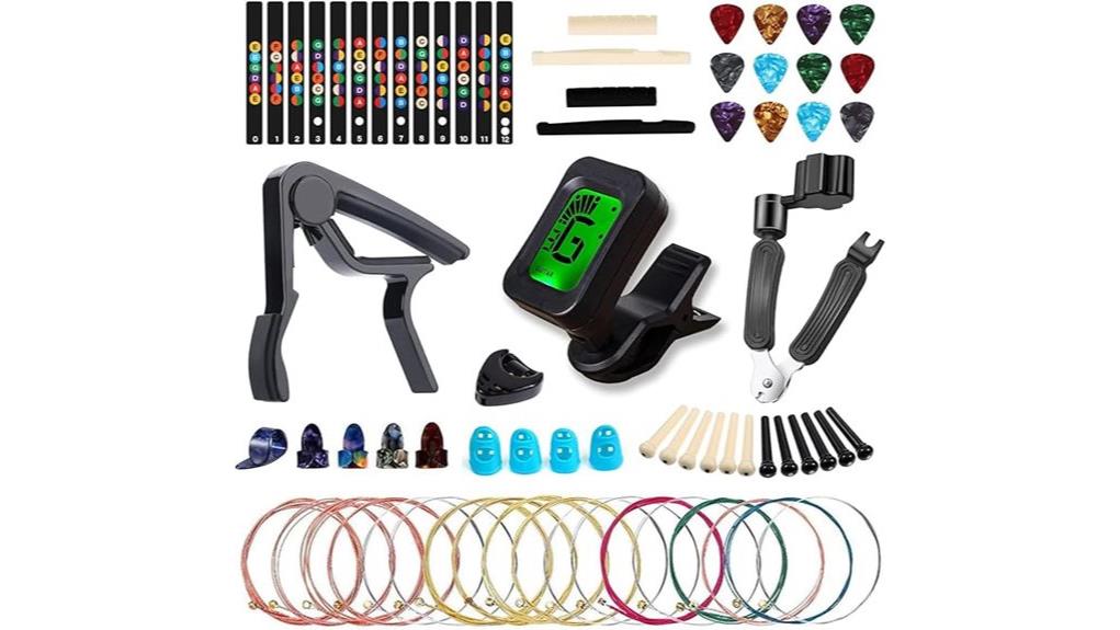 This collection offers fundamental components for learning. The included tuner, assorted picks, and fretboard aids establish a solid foundation for starting the instrument.