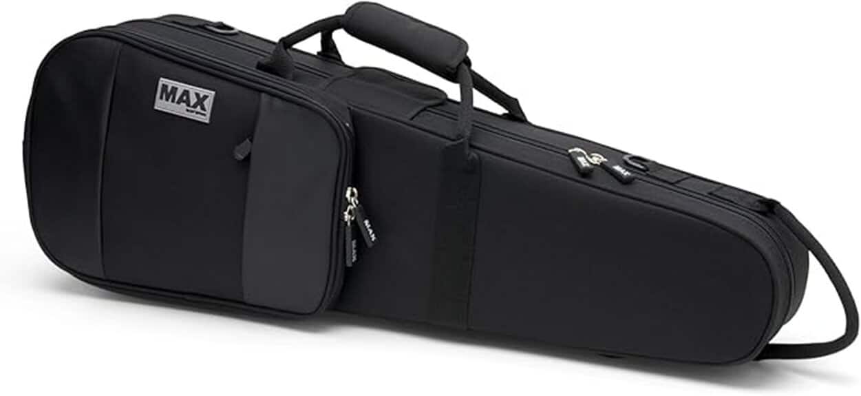 The Protec MX044 Violin Case stands as a demonstration to the harmony between durability and thoughtful design—crafted from resilient 600D nylon and a lightweight EPS foam frame, it offers both protection and ease of transport. Its adjustable backpack straps and sturdy rope handles provide versatile carrying options, akin to how we navigate life’s varied paths. This case not only safeguards the instrument but also nurtures the musician’s spirit, inviting reflection on how we carry our passions through life’s journey. What remains to be explored is how its interior organization enhances this experience.