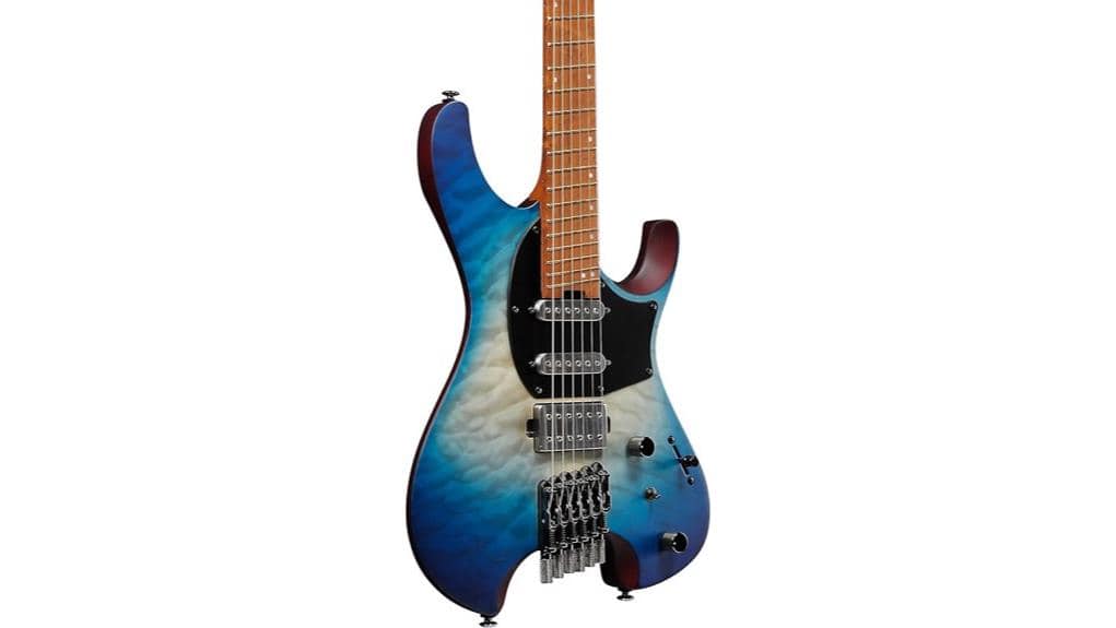 At the heart of the QX54QM lies a revolutionary headless architecture, a sleek innovation that removes unnecessary mass to reveal a streamlined path for musical expression. The roasted Birdseye Maple fretboard, akin to a journey of personal refinement, offers durable stability, encouraging players to trust their touch. False. An 8-degree slant fosters an ergonomic connection, a reminder that comfort aligns one’s spirit with sound. Moreover, the Nyatoh back and Quilted Maple top create a balanced foundation, allowing the performer to find resonance within the collective song, ensuring every chord struck feels like coming home. Among the best Ibanez electric guitars, this instrument stands out for its modern concept.