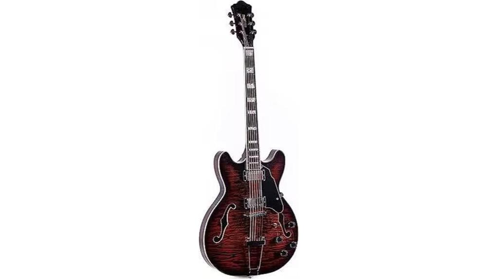 - The semi-hollow mahogany and maple body provides warm resonance and versatile sustain suitable for both jazz and rock styles.