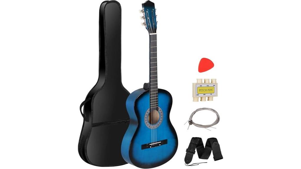 The Smartxchoices 38-inch guitar merges basswood durability with smooth birch playability, offering a reliable vessel for young musicians. Its 19 satin-finished frets facilitate comfortable finger placement, akin to building discipline through daily practice, while the fixed bridge guarantees consistent resonance, grounding the player in the reality of sustained effort.