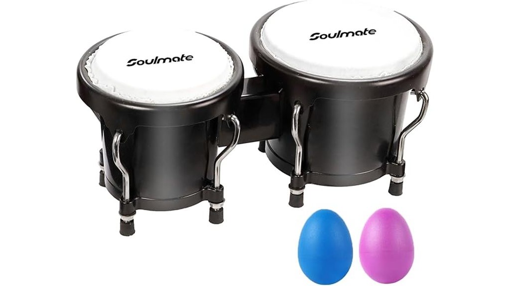 The Soulmate Bongo Drum Set embodies a harmonious blend of craftsmanship and artistry, featuring durable, weatherproof materials and natural animal skin heads that resonate with authentic tones—akin to the deep connections forged through shared musical experiences. This lightweight set, complemented by vibrant egg shakers, invites users to explore their rhythm and creativity, fostering community and personal growth. Such elements serve as a reminder that, much like music, life flourishes through collaboration and expression, encouraging one to discover the depths of their own potential.