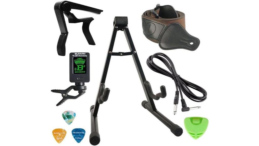 - The kit provides essential accessories, including an A-frame stand, 10-foot cord, strap, and capo for immediate instrument support.