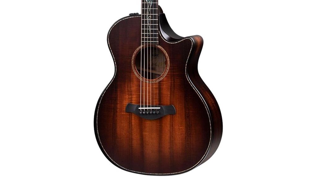 The grand auditorium silhouette of the Taylor K24ce Builder’s Edition, an embodiment of ergonomic precision and sonic breadth, serves as the vessel for the instrument’s resonant voice, bridging the physical domain with the spiritual through engineering.