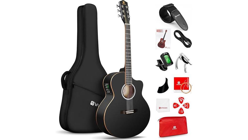 The Vangoa 3/4 Acoustic Electric Guitar combines a spruce top and sapele back to offer vibrant resonance, akin to a soul finding its true voice in a quiet room. Its precise 18:1 tuners guarantee stability, a reminder that spiritual growth requires both attention and patience.