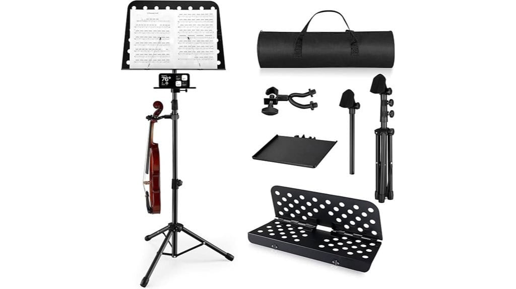 The Vangoa Music Stand exemplifies the harmony between innovation and practicality, featuring a height adjustment range of 23.6 to 70.8 inches—akin to the varied heights we encounter in life’s journey. This six-in-one design not only accommodates diverse musical settings but also serves as a reminder that adaptability is essential for growth. Crafted from durable foldable steel, it supports up to 13 lbs, ensuring resilience amid life’s challenges—an invitation to explore how this tool can enhance one’s musical expression and community connection.