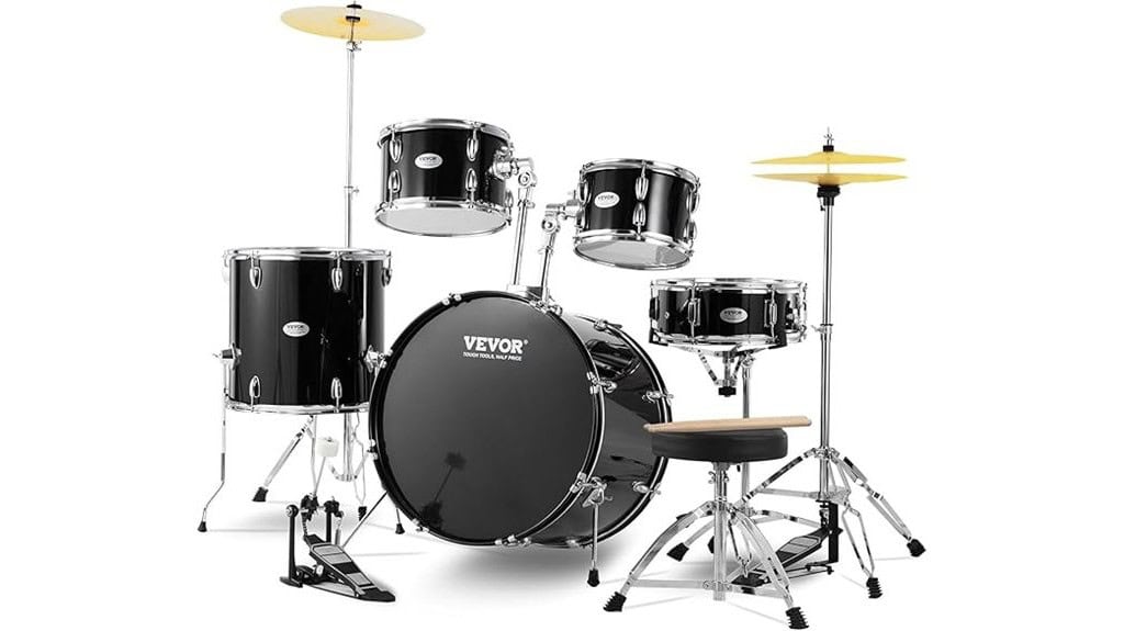 The VEVOR Adult 5-Piece Drum Set stands as a symbol of the harmony between craftsmanship and personal growth—crafted from premium poplar wood, it offers warm tones that resonate with the soul, while its durable carbon steel stands provide stability akin to the unwavering support of a mentor. This kit invites rhythmic exploration, encouraging players to forge their unique musical identities. As one contemplates its features, they may wonder how such tools can enhance their journey towards mastery and self-discovery.