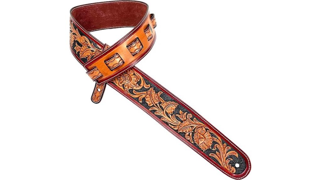 - The strap features hand-tooled Sheridan leather with a 2.5-inch width and contrasting stitching for distinct visual appeal.