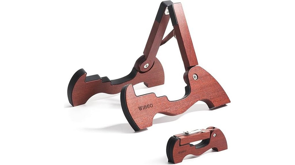 The WINGO Wood Guitar Stand stands as a representation of both craftsmanship and functionality—crafted from solid Sapele Mahogany, its durability mirrors the strength found in a musician’s journey. With adjustable-width settings, it accommodates diverse guitar types, reminding us that adaptability is key in both art and life. The lightweight, foldable design enhances portability, akin to the graceful mobility of a wandering minstrel. As musicians reflect on their craft, they will discover how this stand becomes more than mere support; it symbolizes unwavering commitment to their passion.