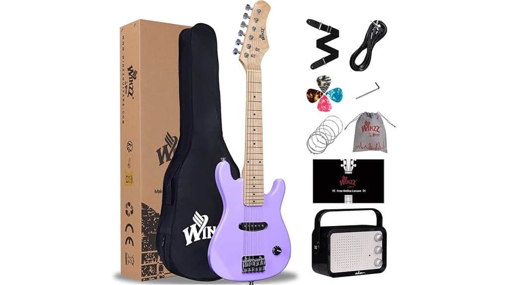 The WINZZ EGM100 Electric Guitar embodies a harmonious blend of craftsmanship and innovation—its compact 30-inch body is designed for ease of play, mirroring the journey of personal growth that begins with small steps. Upgraded closed machine heads guarantee stability in tuning, much like the steadfastness one seeks in life’s pursuits. This instrument, with its versatile sound performance, serves as a reminder that exploring creativity can lead to profound self-discovery and fulfillment—what awaits those who embrace this journey?