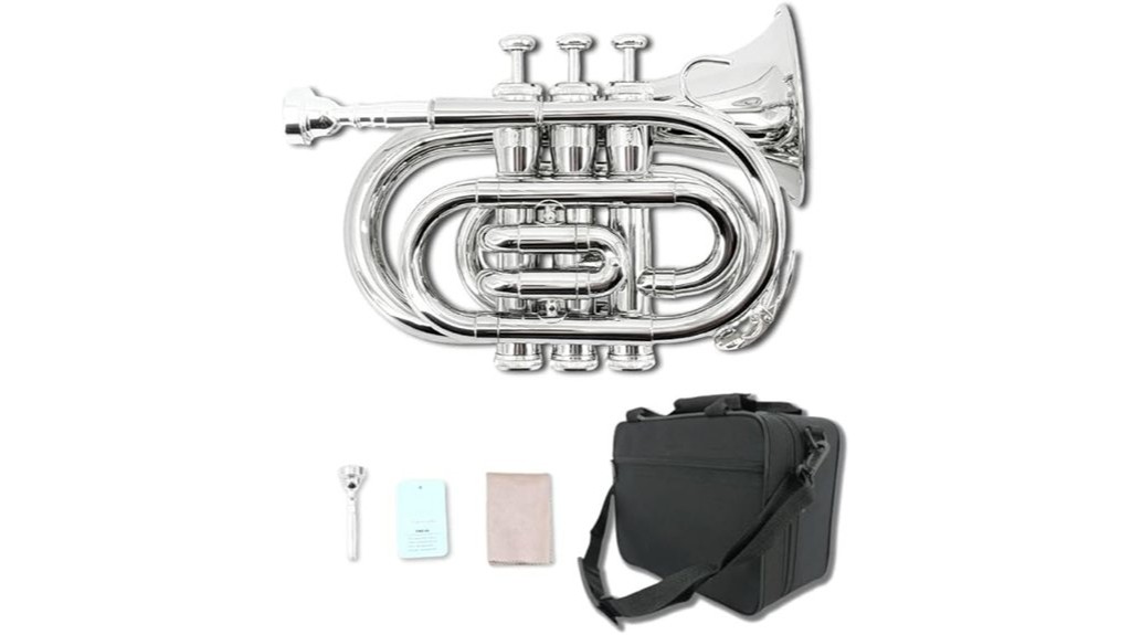 The WUQIMUSC Brass Pocket Trumpet, with its Bb key and resilient nickel-plated finish, offers both portability and sound quality, weighing a mere 4.1 pounds—much like the lightness of spirit we seek in our musical journeys. This instrument, equipped with a 7C mouthpiece, serves as a reminder that every note played can resonate deeply within us, fostering personal growth and creative exploration. As we explore its features, one might wonder how such an instrument can transform our expression, inviting further contemplation.
