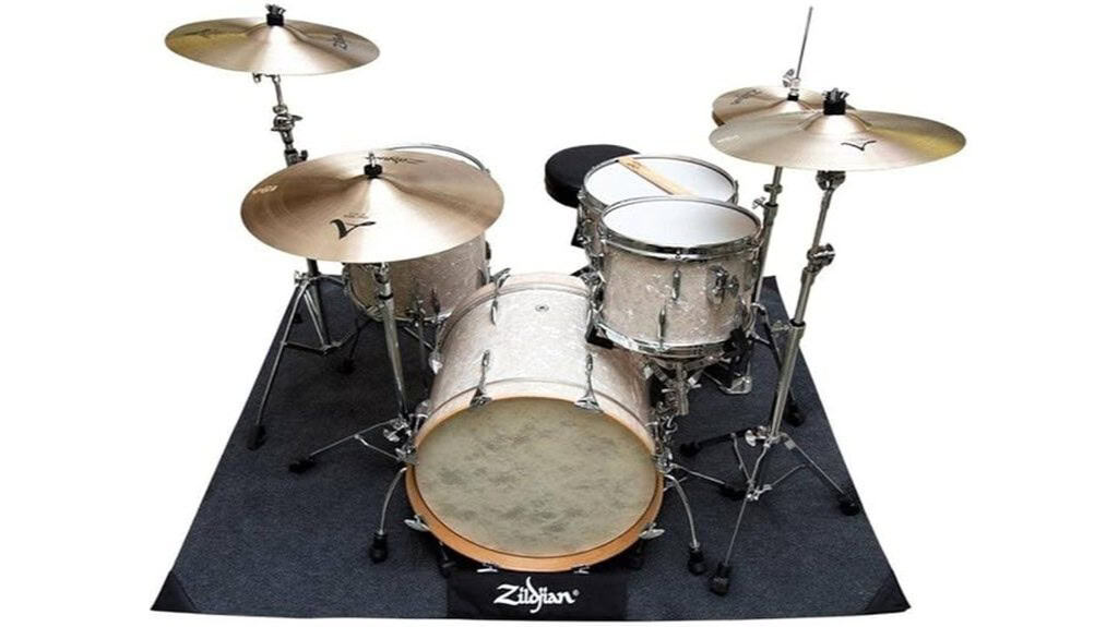 The Zildjian Gig Drum Set Rug stands as a demonstration of durable craftsmanship—crafted from heavy-duty polypropylene, it embodies stability through its non-skid rubber backing and weighted corners, providing a steadfast platform for musical expression. Measuring 5.5 by 4.5 feet, it offers a compact yet generous space, akin to how life’s challenges can be both small and profound. This rug not only supports instruments but serves as a reminder that a solid foundation nurtures growth, inviting exploration of its many features.